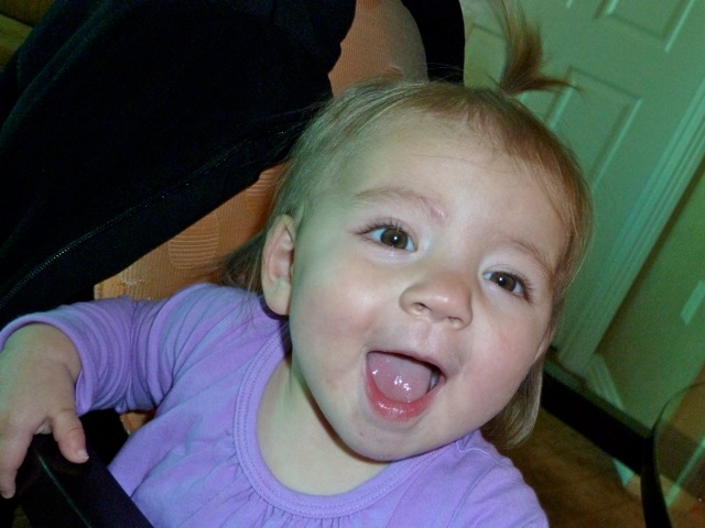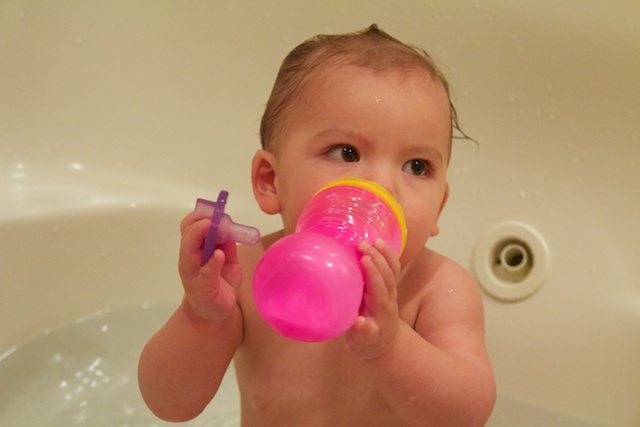 Autumn was thirsty so Diane helped her drink from a big girl bottle. Only Diane wasn’t so good at helping so Autumn got all wet and Grandma had to dry her pants with the hair dryer.