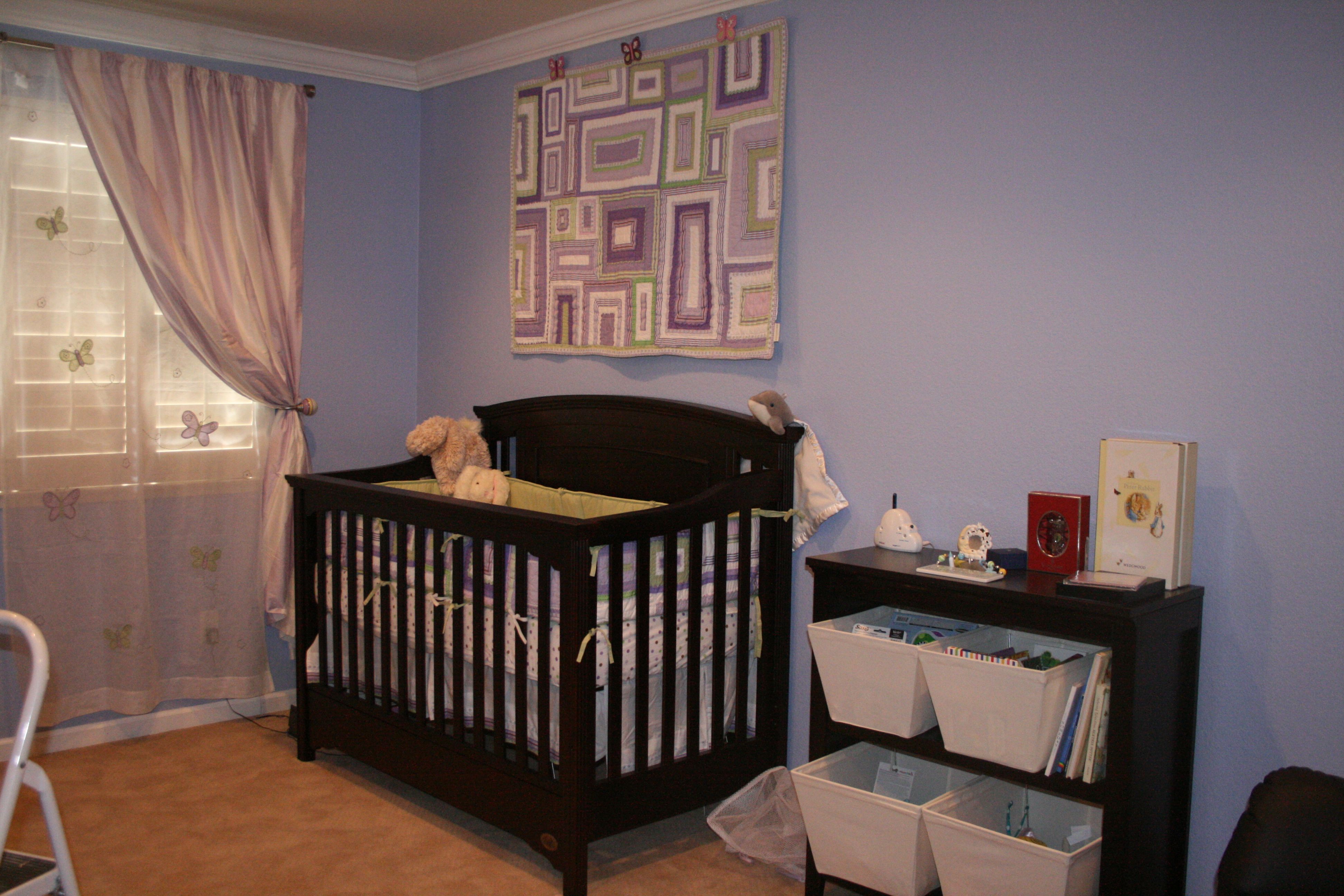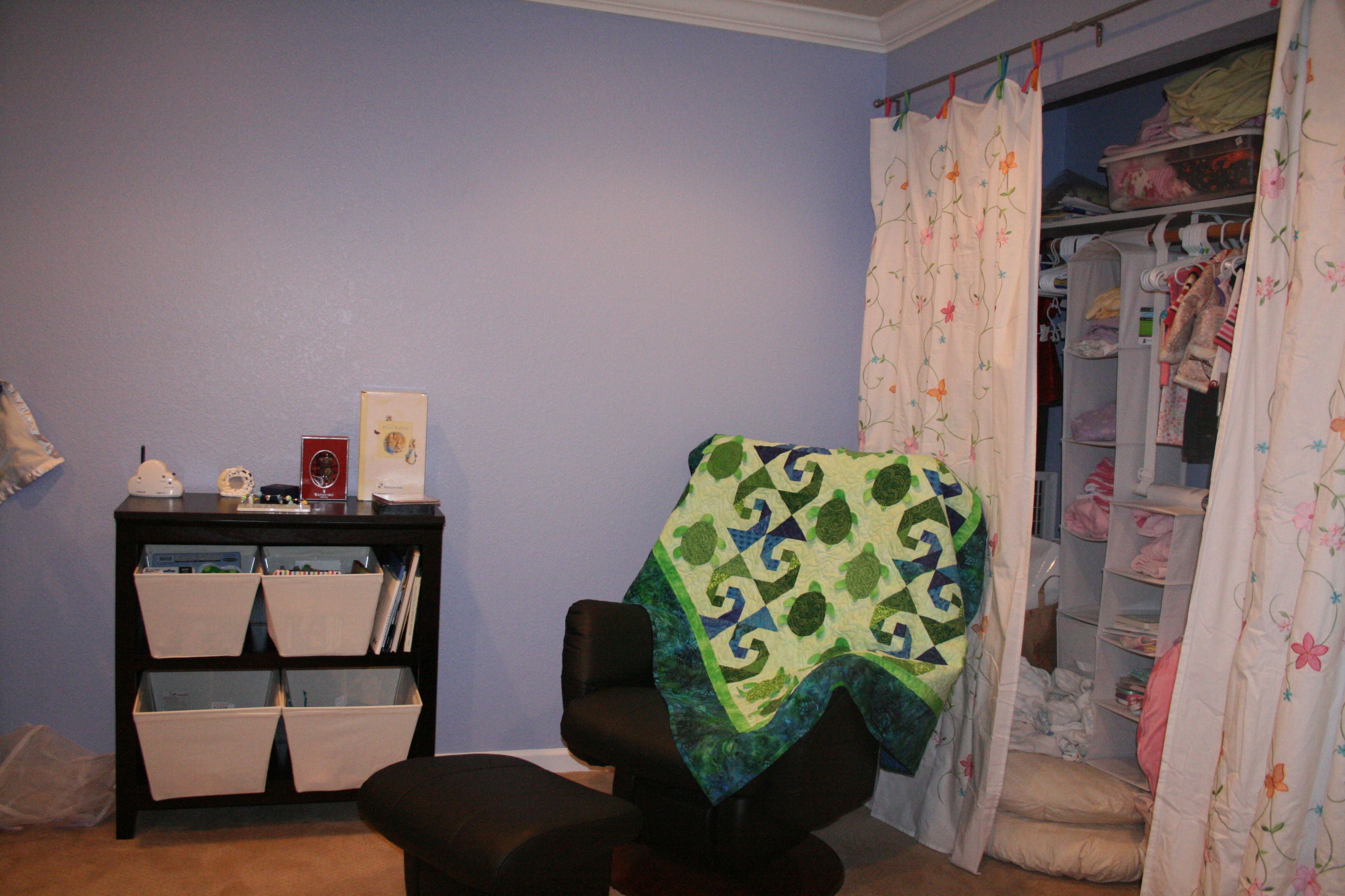 Grandma Doyle made the turtle quilt. You can’t tell but each of their flippers can wave to me. Here’s my crib with my matching quilt hanging above me. There are even little butterflies holding this one on the wall.