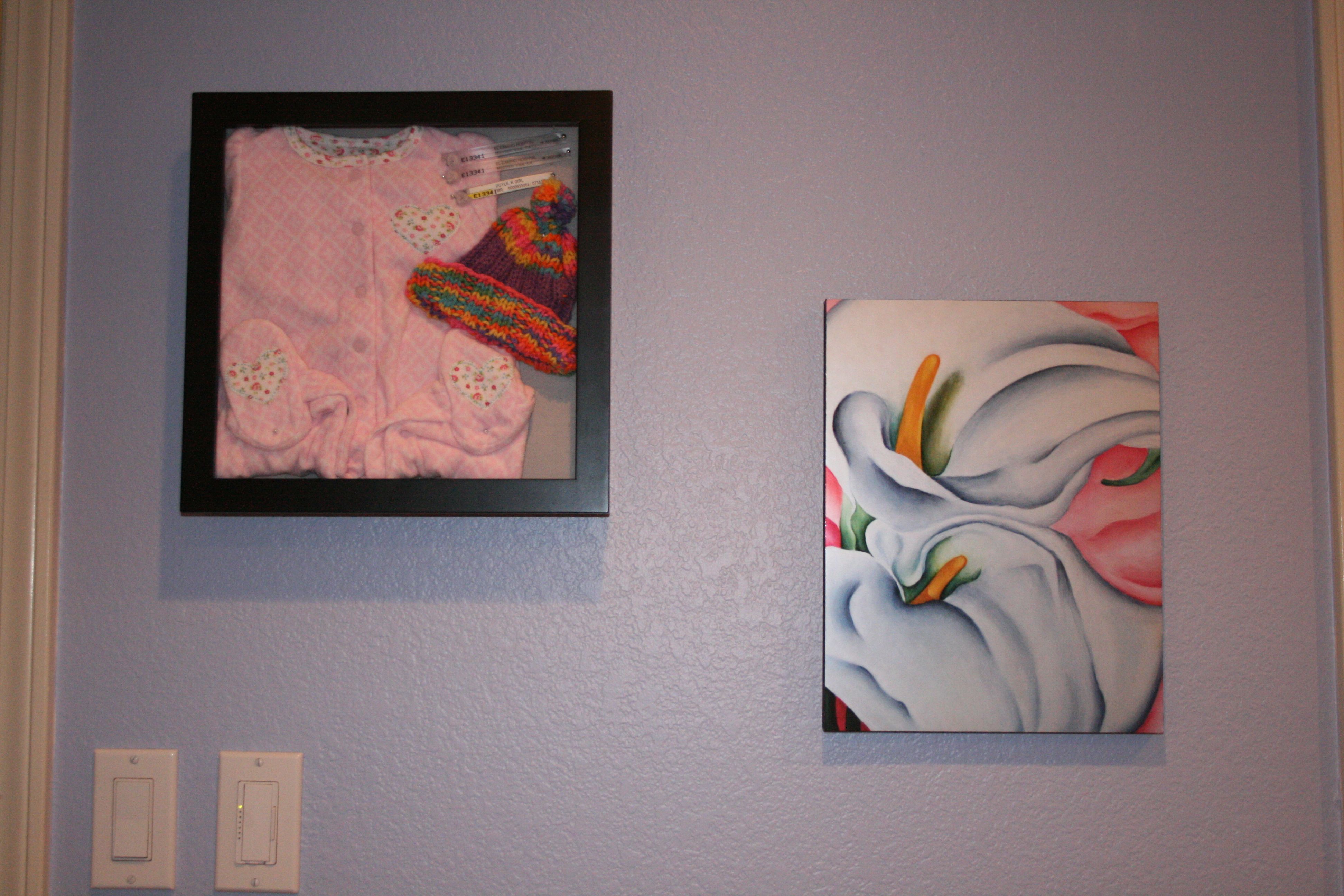There’s 2 things on the wall between my doors. The one on the right is a picture that Aunt Caitlin painted. On the left is a shadow box that has the wrist bands that Mom, Dad, and I wore at the hospital, and my outfit and hat I wore home from the hospital.