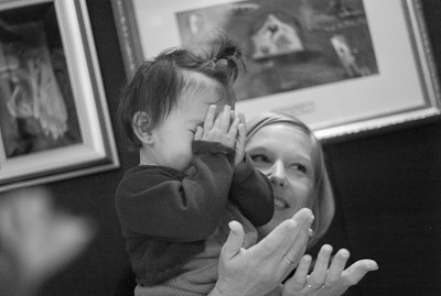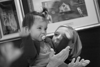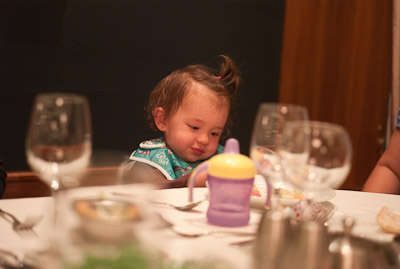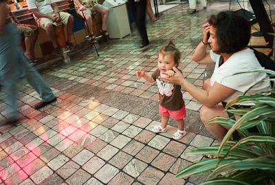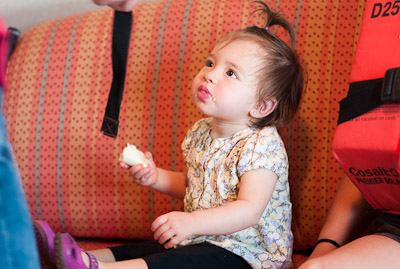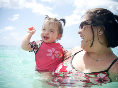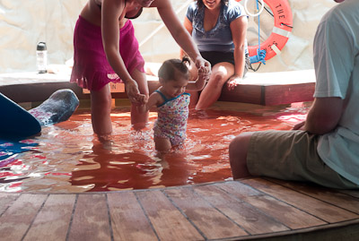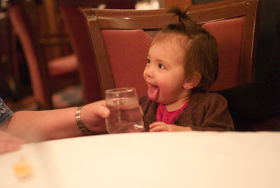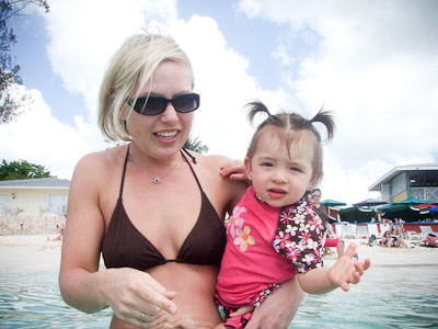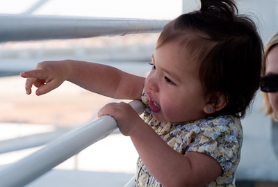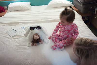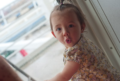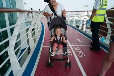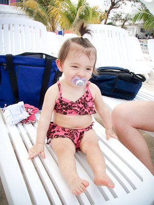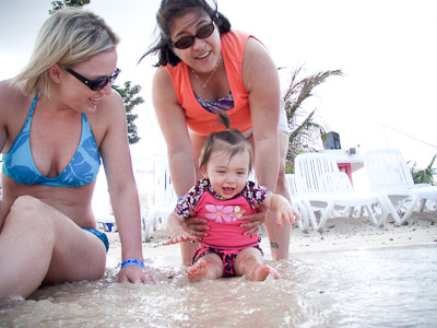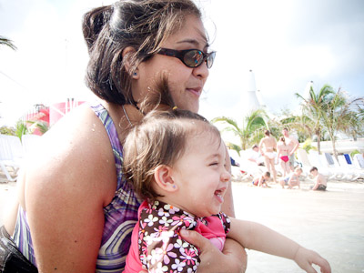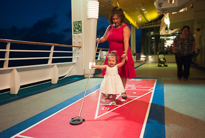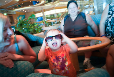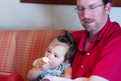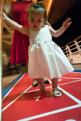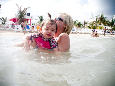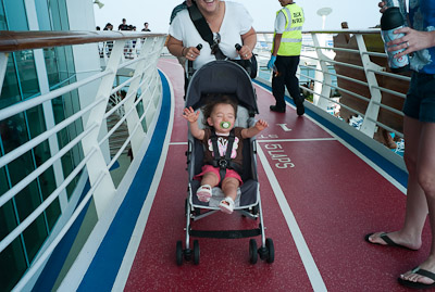 I got to swim in the ocean in Cozumel and Grand Cayman. I didn’t like the sand or the ocean at first, but once I got in, it was great! One of my favorite things was to play on the balcony of our room. I got to yell at the birds, feel the wind, and play in the water on the floor. You can’t imagine all the food on a boat! I had a fresh bowl of cut up fruit waiting for me at dinner every night! I got sourdough rolls, ice cream, chocolate, and a different kind of fruit soup each dinner. I saw an ice skating show, and 2 dancing shows. I got to dance to all the different music that was playing, watch Dad play in the arcade, go for walks, play with other babies, but mostly-I got spoiled by all the attention I got with all my family there.