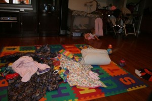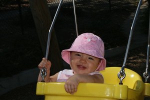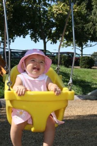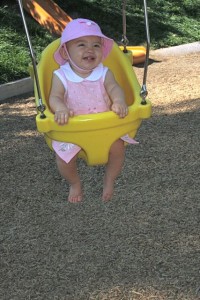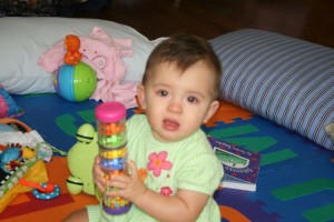 It was another week of “firsts” for me. No-I didn’t learn to crawl yet. This week was my first cold and first fever. My grandma usually watches me, but she went to Hawaii so Mom and Dad had already worked out a plan to watch me this week. But I got them! I got sick and couldn’t go to daycare so they had to scramble to be able to watch me ALL week. Dad stayed home 1/2 of Monday and Thursday, and Mom stayed home the other 1/2 of Monday, Tuesday, and Wednesday. It was great staying home with them all week, but being sick is not fun. My nose ran like a faucet for a few days, then it got so stuffy I couldn’t breathe. I still have a humidifier in my room and 2 of the legs of my crib are on phone books so that my bed is at an angle. My fever would get up to 103.5, and I was cranky and clingy. Everything made me cry and I didn’t feel like eating. Have you ever tried to drink a bottle with a stuffy nose? Let me tell you-it is not easy! Mom took a couple of pictures of me on one of my getting better days. There’s no pictures from my sick days because I wouldn’t let them put me down-ever!