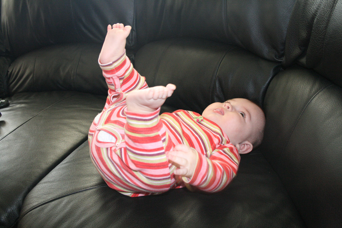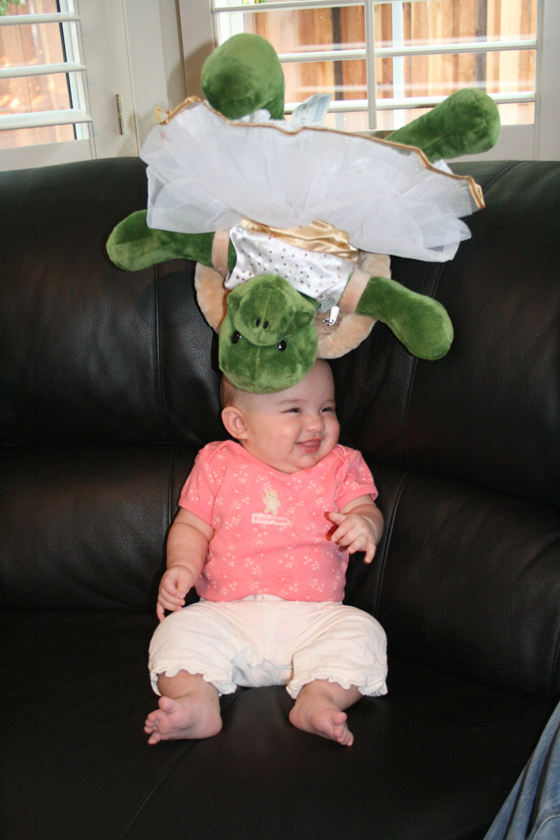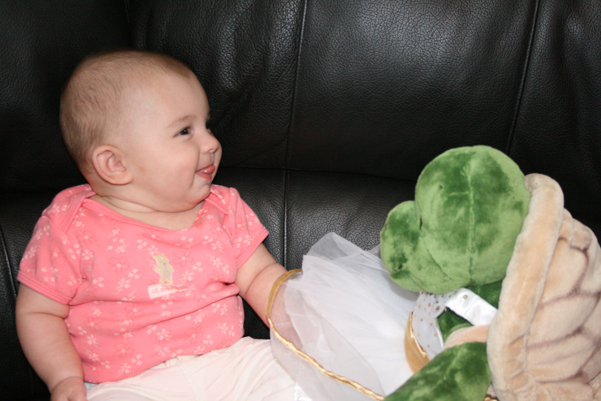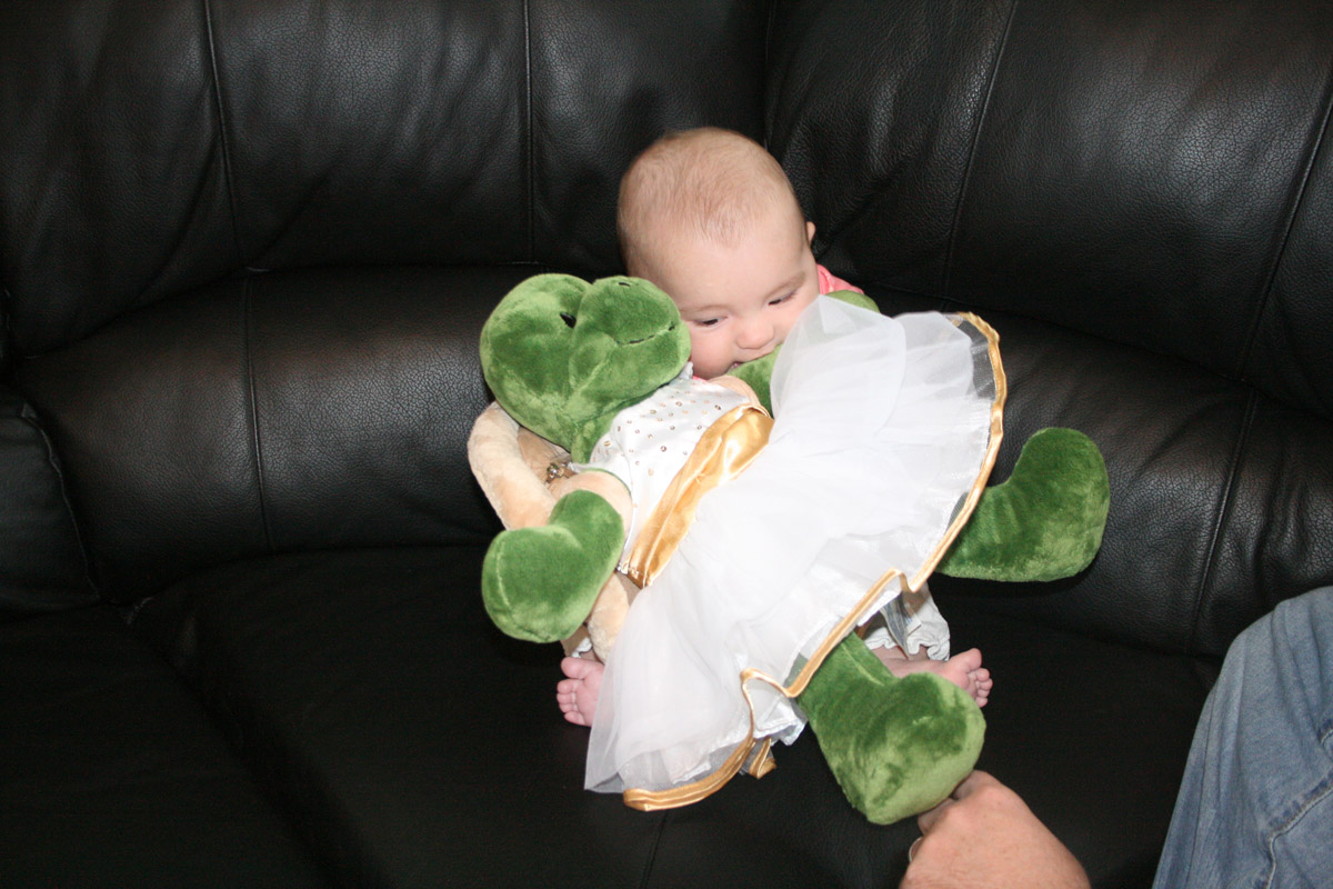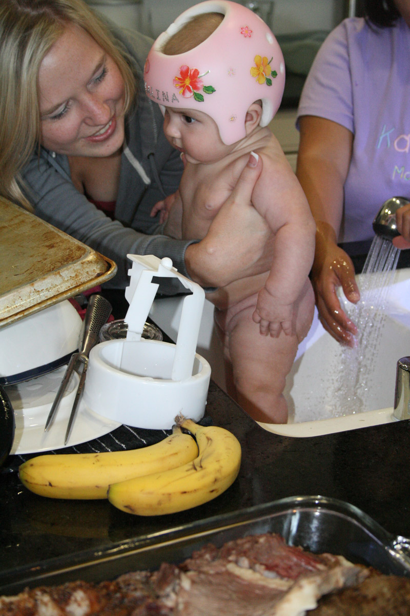Friday night Caitlin and I played “Super Hero Kalina”. I had a cape and flew all around. (Well, until Auntie Caitlin’s arms got tired!) Then I barfed a little on their counter-Oops!