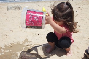 Dad and I were trying to figure out how to get water in my bucket. I don’t like to touch the water and Daddy didn’t want to get wet. We decided to let Mommy get the water!